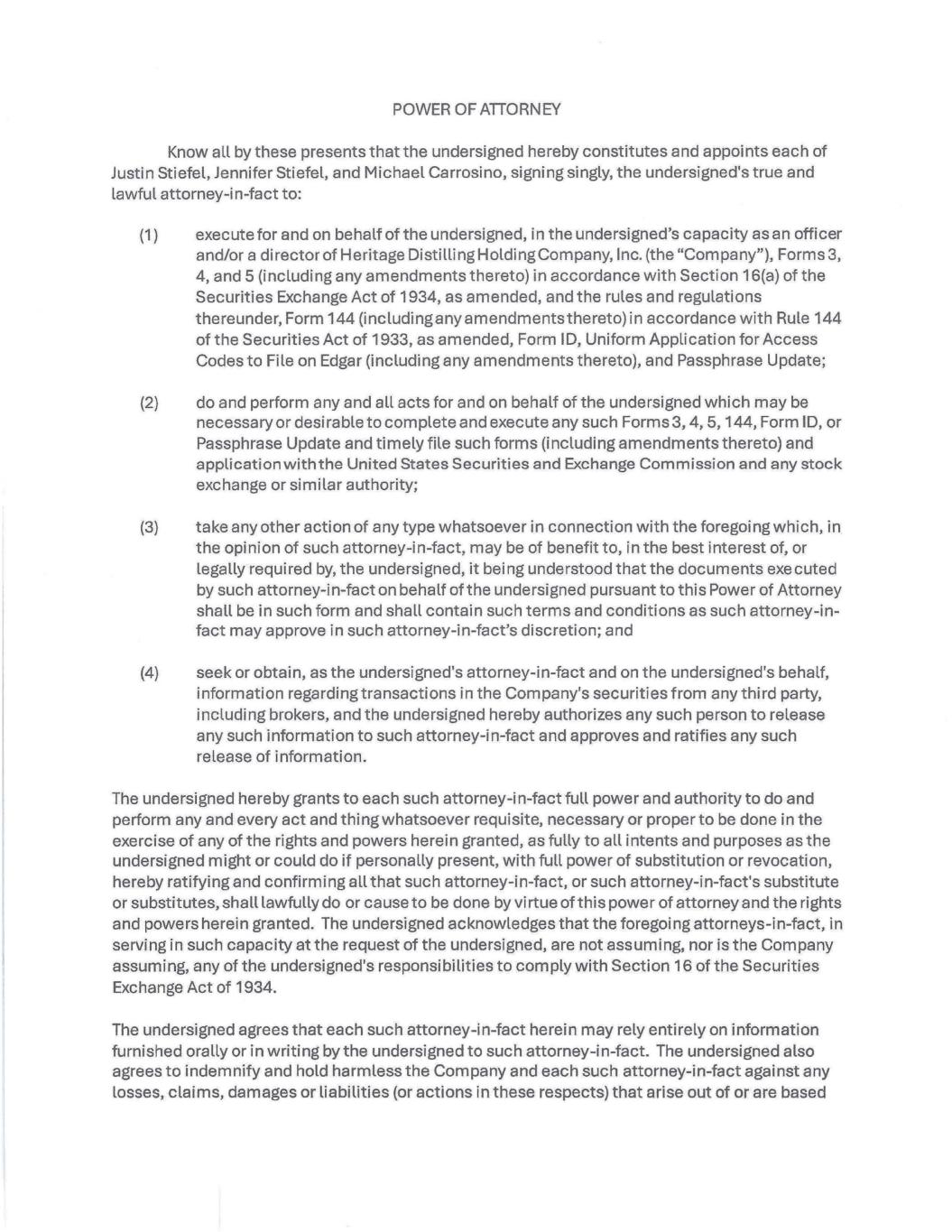 POWER OF ATTORNEY Know all by these presents that the undersigned hereby constitutes and appoints each of Justin Stiefel, Jennifer Stiefel, and Michael Carrosino, signing singly, the undersigned's true and lawful attorney-in-fact to: (1) execute for and on behalf of the undersigned, in the undersigned's capacity as an officer and/or a di rector of Heritage Distilling Holding Company, Inc. (the "Company"), Forms 3, 4, and 5 (including any amendments thereto) in accordance with Section 16(a) of the Securities Exchange Act of 1934, as amended, and the rules and regulations thereunder, Form 144 (includinganyamendmentsthereto) in accordance with Rule 144 of the Securities Act of 1933, as amended, Form ID, Uniform Application for Access Codes to File on Edgar (including any amendments thereto), and Passphrase Update; (2) do and perform any and all acts for and on behalf of the undersigned which may be necessary or desirable to complete and execute any such Forms 3, 4, 5, 144, Form ID, or Passphrase Update and timely file such forms (including amendments thereto) and applicationwiththe United States Securities and Exchange Commission and any stock exchange or similar authority; (3) take any other action of any type whatsoever in connection with the foregoing which, in the opinion of such attorney-in-fact, may be of benefit to, in the best interest of, or legally required by, the undersigned, it being understood that the documents executed by such attorney-in-fact on behalf of the undersigned pursuant to this Power of Attorney shall be in such form and shall contain such terms and conditions as such attorney-in tact may approve in such attorney-in-fact's discretion; and (4) seek or obtain, as the undersigned's attorney-in-fact and on the undersigned's behalf, information regarding transactions in the Company's securities from any third party, including brokers, and the undersigned hereby authorizes any such person to release any such information to such attorney-in-fact and approves and ratifies any such release of information. The undersigned hereby grants to each such attorney-in-fact full power and authority to do and perform any and every act and thing whatsoever requisite, necessary or proper to be done in the exercise of any of the rights and powers herein granted, as fully to all intents and purposes as the undersigned might or could do if personally present, with full power of substitution or revocation, hereby ratifying and confirming all that such attorney-in-fact, or such attorney-in-fact's substitute or substitutes, shall lawfully do or cause to be done by virtue of this power of attorney and the rights and powers herein granted. The undersigned acknowledges that the foregoing attorneys-in-fact, in serving in such capacity at the request of the undersigned, are not assuming, nor is the Company assuming, any of the undersigned's responsibilities to comply with Section 16 of the Securities Exchange Act of 1934. The undersigned agrees that each such attorney-in-fact herein may rely entirely on information furnished orally or in writing by the undersigned to such attorney-in-fact. The undersigned also agrees to indemnify and hold harmless the Company and each such attorney-in-fact against any losses, claims, damages or liabilities (or actions in these respects) that arise out of or are based