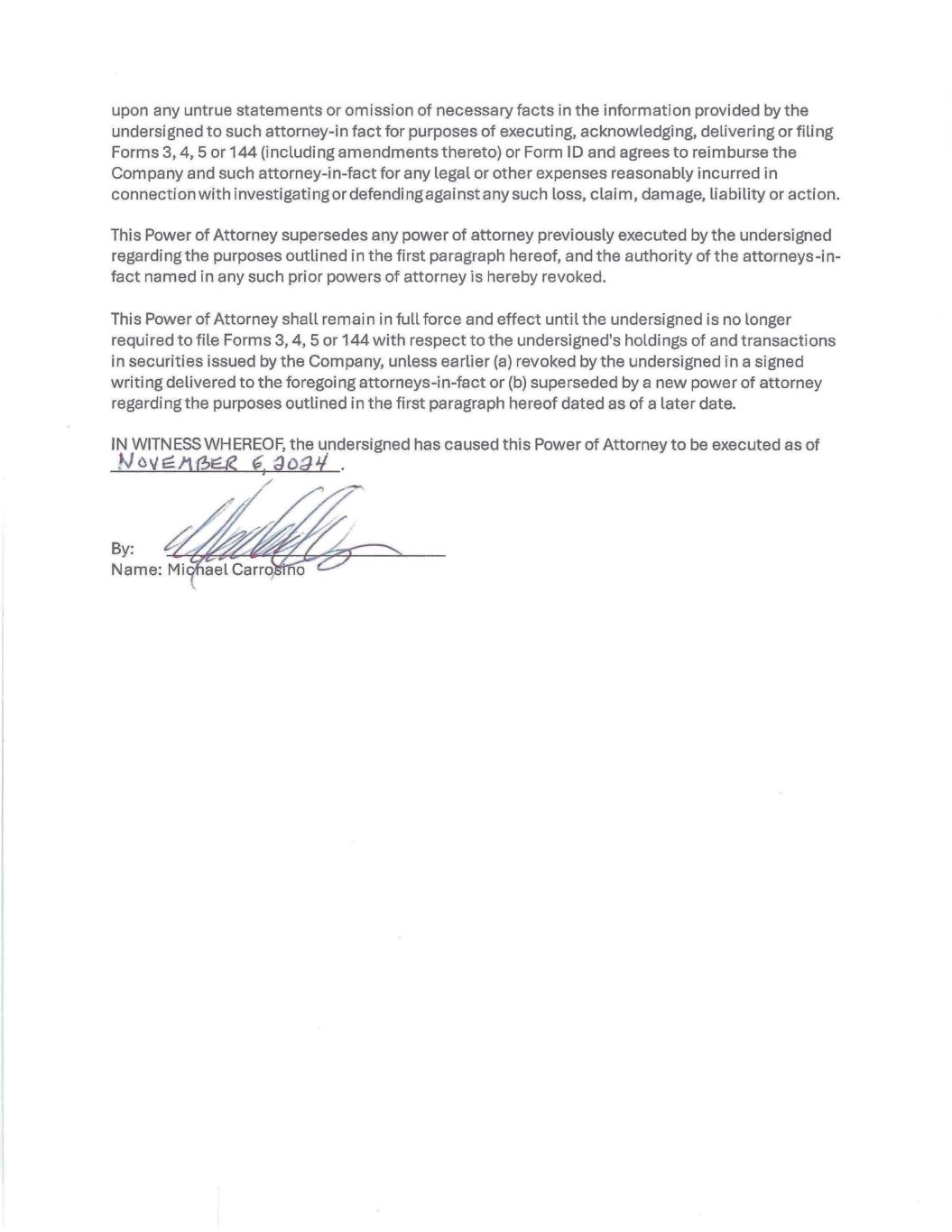 upon any untrue statements or omission of necessary facts in the information provided by the undersigned to such attorney-in fact for purposes of executing, acknowledging, delivering or filing Forms 3, 4, 5 or 144 (including amendments thereto) or Form ID and agrees to reimburse the Company and such attorney-in-fact for any legal or other expenses reasonably incurred in connection with investigatingordefendingagainstanysuch loss, claim, damage, liability or action. This Power of Attorney supersedes any power of attorney previously executed by the undersigned regarding the purposes outlined in the first paragraph hereof, and the authority of the attorneys-in fact named in any such prior powers of attorney is hereby revoked. This Power of Attorney shall remain in full force and effect until the undersigned is no longer required to file Forms 3, 4, 5 or 144 with respect to the undersigned's holdings of and transactions in securities issued by the Company, unless earlier (a) revoked by the undersigned in a signed writing delivered to the foregoing attorneys-in-fact or (b) superseded by a new power of attorney regarding the purposes outlined in the first paragraph hereof dated as of a later date. IN WITNESS WHEREOF, the undersigned has caused this Power of Attorney to be executed as of ~ ~ \J f:=. )'\ ('Jed?, ~-1 {J D{} 1/ . By: